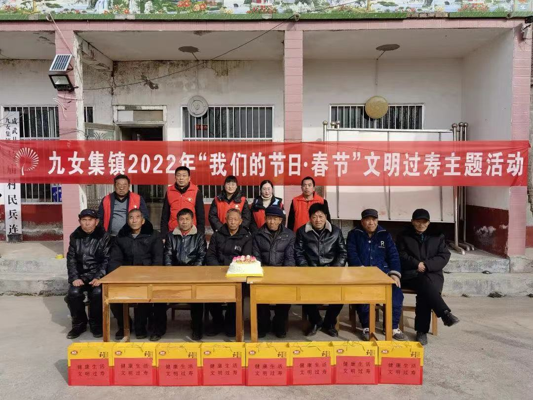 九女集镇新时代文明实践服务队的志愿者为镇驻地66岁老人集体过寿