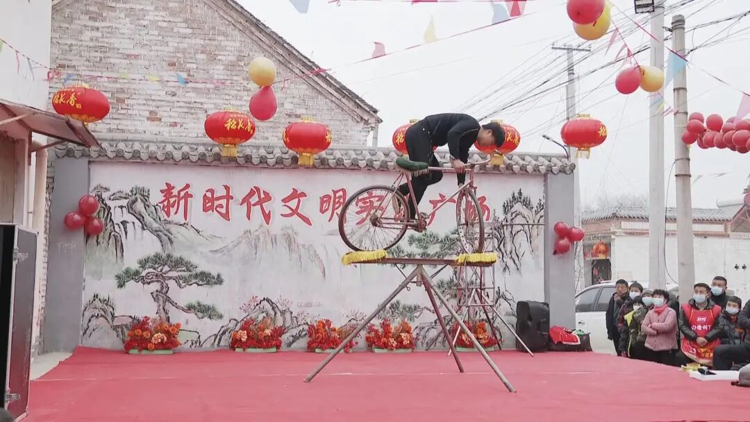 走进胡楼村文化广场,记者看到活动现场人头攒动,演出队伍身着五颜六色的表演服装,歌曲、杂技、戏曲、舞狮等精彩节目相继上演,爆发出阵阵掌声。