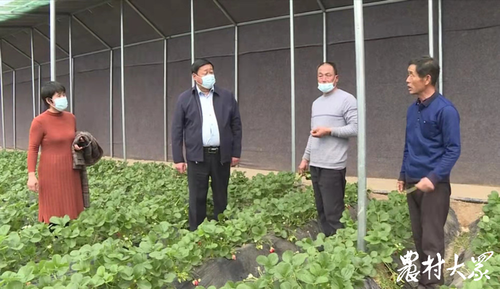 朱仰文(左二)在合作社草莓大棚里。(资料图)