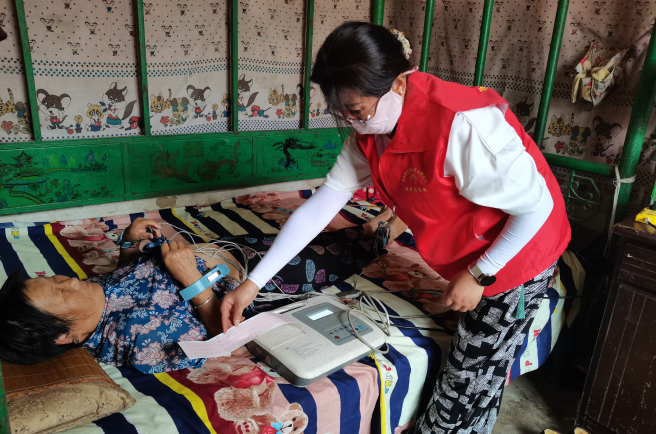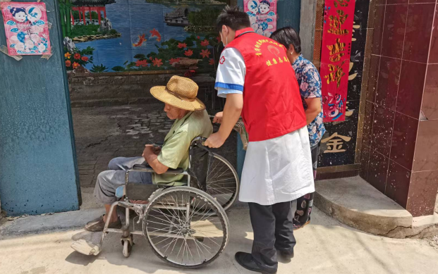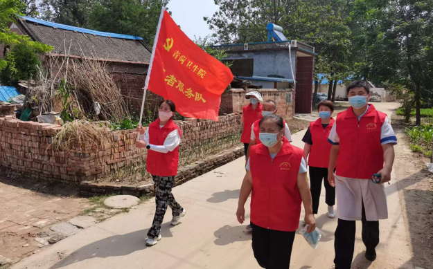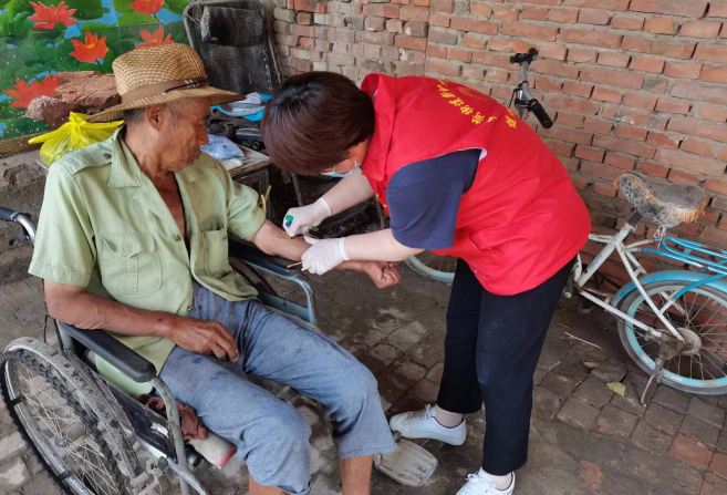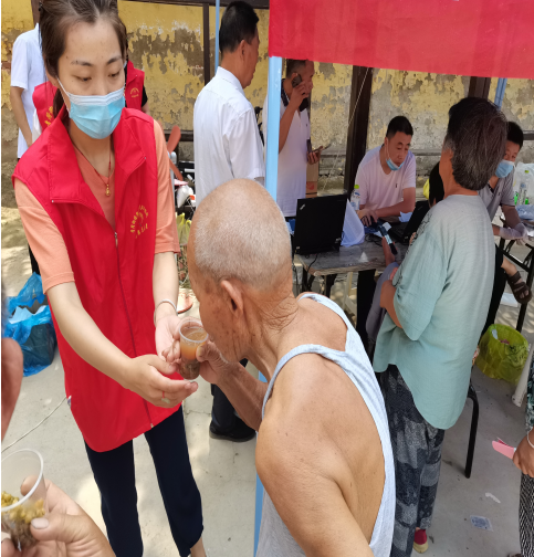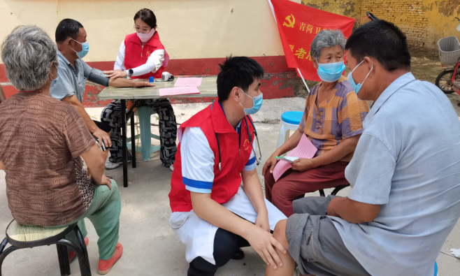 现场不太忙的时候,志愿者们顾不上休息,冒着37、8度的高温还为行动不方便的病人进行上门诊疗,亮丽的红旗飘在乡村小道,红马甲走街串巷,这也成为火热的夏天一道亮丽风景线。