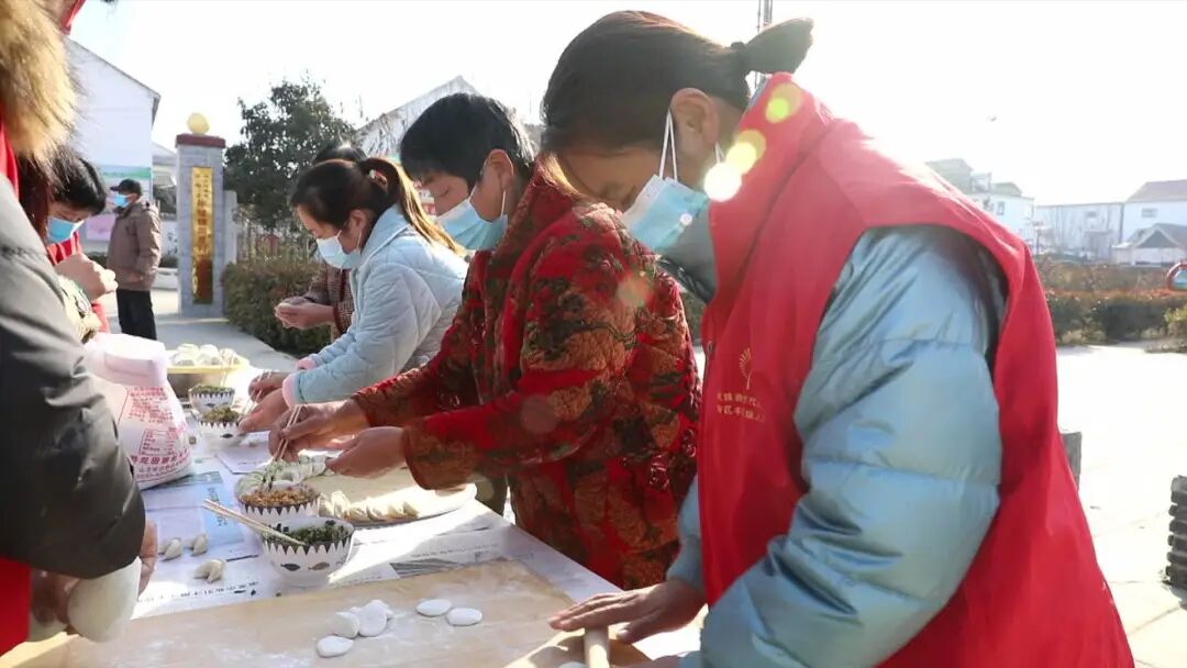 在半堤镇周庄村的文化广场上,志愿者和部分村民一起动手包饺子,大家你擀皮、我包馅忙个不停,不一会的功夫,一个个五颜六色,形态各样的饺子呈现在眼前。为了让村里的老年人都吃上可口的冬至饺子,志愿者们准备了多种饺子馅,饺子皮也是用各种蔬菜汁和面做成的,确保老年人吃得健康又美味。孩子们也参与进来,他们一边在大人的指导下学着怎么包饺子,一边了解冬至习俗,将传统文化与现实生活体验更好地联系起来,在活动中感受敬老、爱老的浓厚氛围。热气腾腾、香喷喷的饺子出锅后,志愿者端到老人们跟前,大家品尝着饺子,细数着当今的好日子,脸上挂满笑容。