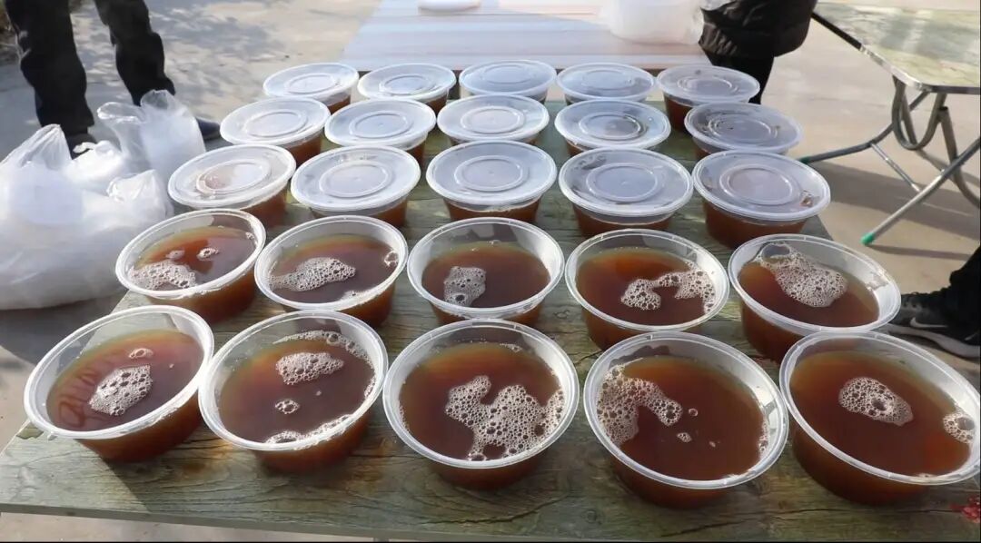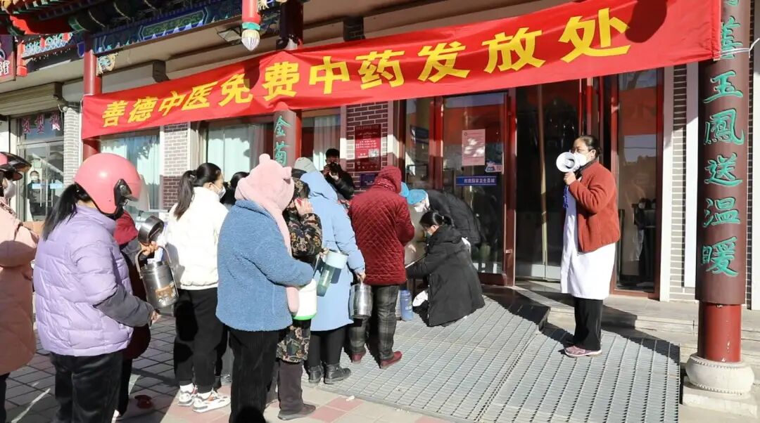 12月22日上午,郓城县唐塔街道花园社区善德中医门口排起了长队,居民拿着快餐杯、保温盒等有序领取中药“大锅汤”。