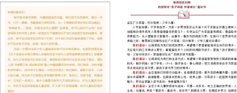 牡丹区妇联线上发出全民阅读倡议书,倡导广大家庭以书香启迪智慧,用诵读润泽心田,积极创建“书香家庭”,乐享亲子阅读时光。各级妇联联动开展“书香飘万家 阅启新征程”家庭亲子阅读活动,把“读书好、好读书、读好书”理念融入家教家风,引领家长和孩子们学会阅读、爱上阅读、坚持阅读。
