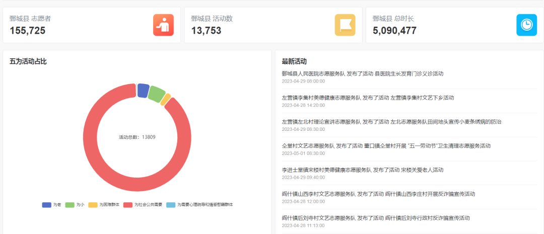 ▲“志愿山东”云平台鄄城志愿者15.5万余名,活动数1.3万余场次,时长达509万余小时