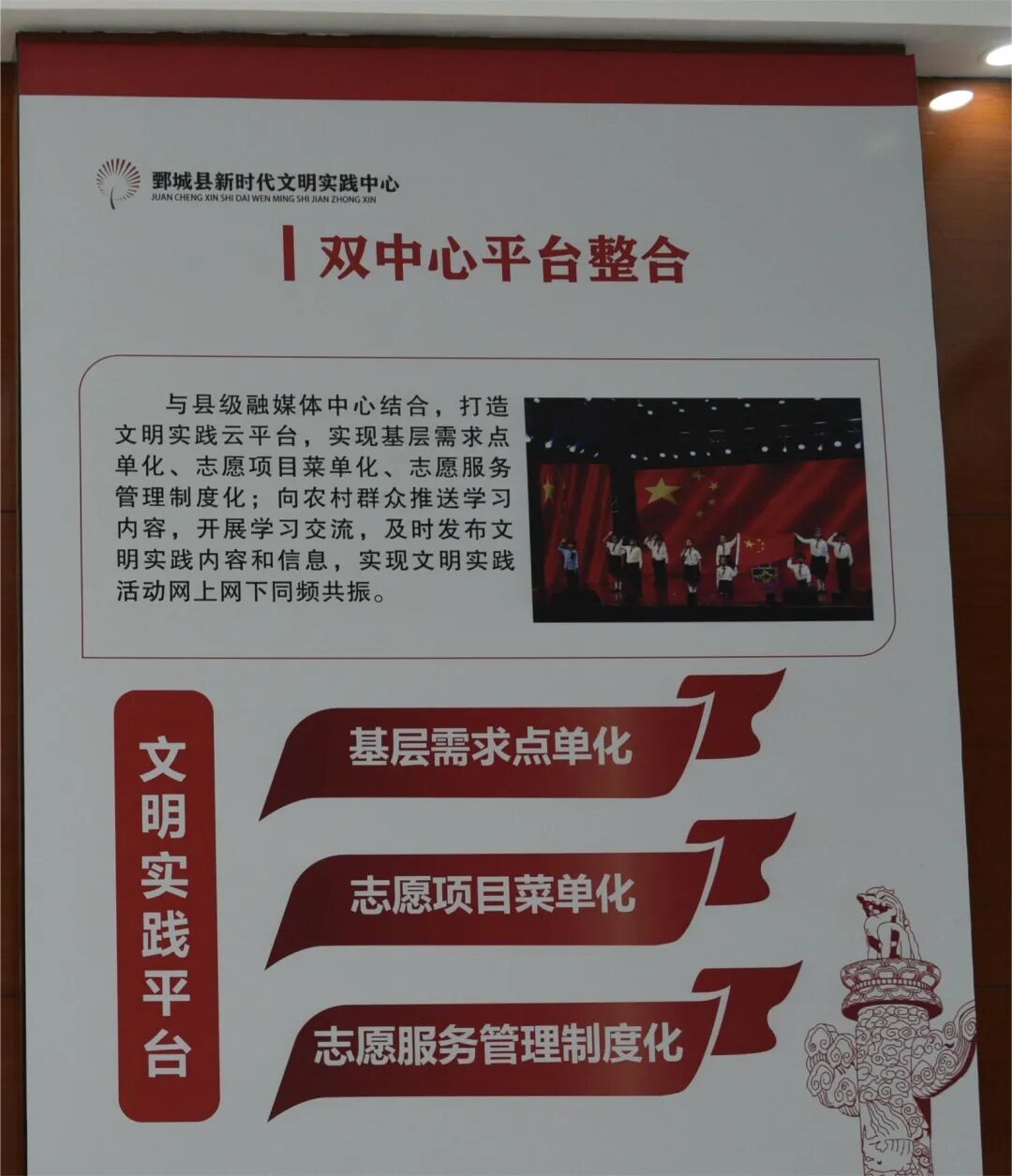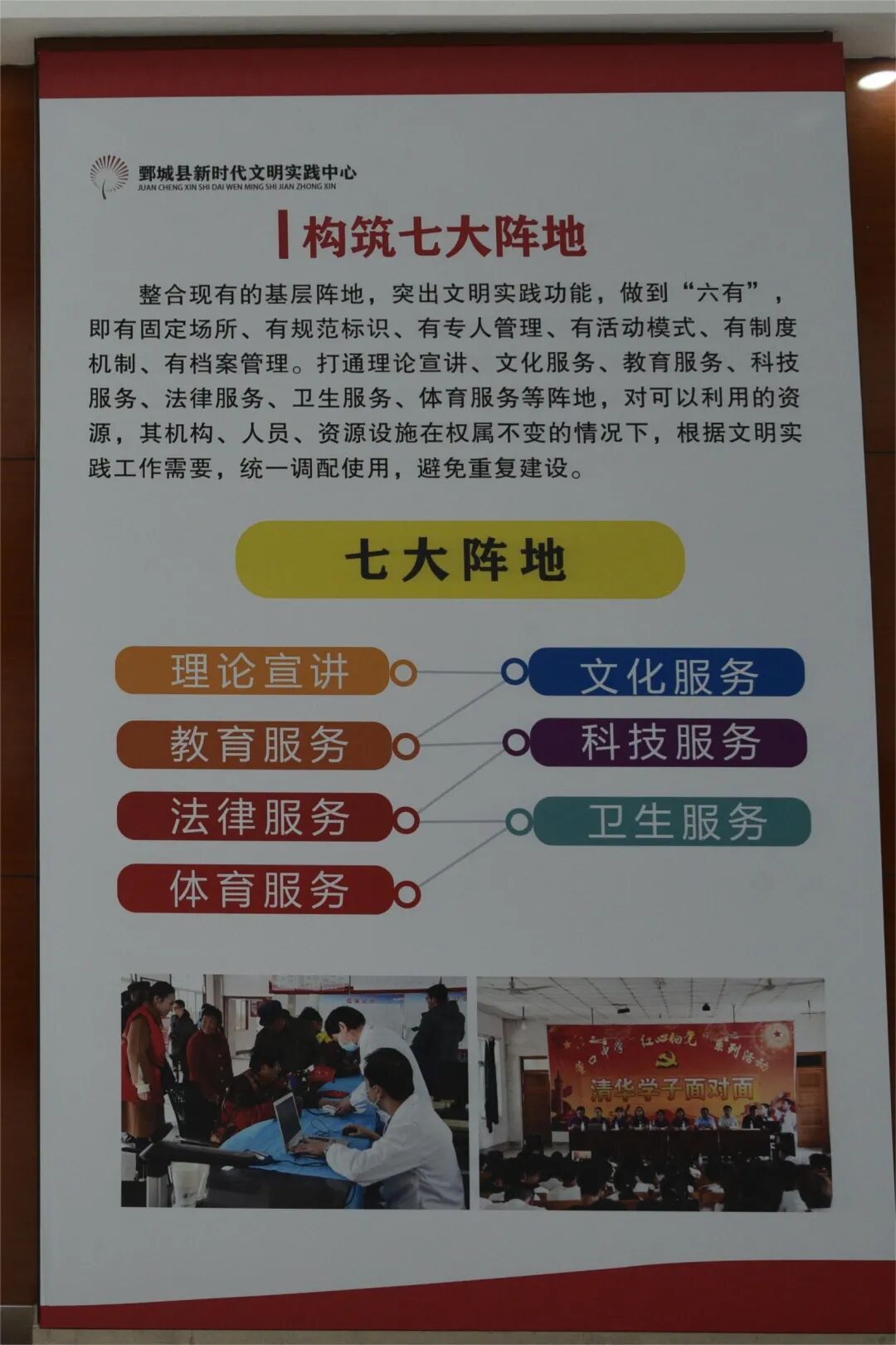 鄄城县结合自身实际不断创新和拓展新时代文明实践中心建设方式方法,整合党建、文化、教育、医疗等多方资源,开启“文明实践+”模式,不仅构建起家门口的精神家园,也让居民群众感受到了实实在在的好处。全域统筹,让群众成为优质资源的享有者。组建专兼结合的宣讲队伍,建立理论宣讲平台,创新打造“鄄涓细流”宣讲品牌;由县教体局牵头,团县委配合,打造乡村“复兴少年宫”,建立教育服务平台;由县文旅局牵头,县文联配合,建立文化服务平台,开展文化文艺活动、落实“山东手造”推进工程;由县科协牵头,县农村农业局、县社科联配合,建立科技与科普服务平台;由县卫健局牵头,县医疗机构配合,建立健康健身服务平台,常态化开展卫生健康志愿服务活动。其不仅极大地改善和丰富了基层群众的精神文化生活,也有力地助推了城乡经济社会快速发展。
