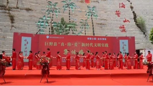 为培育时代新风新貌,推进移风易俗,5月20日,巨野县举办“真·简·爱”新时代文明实践集体婚礼,18对“新人”披红挂彩,倡导移风易俗、婚事新办的社会文明新风。