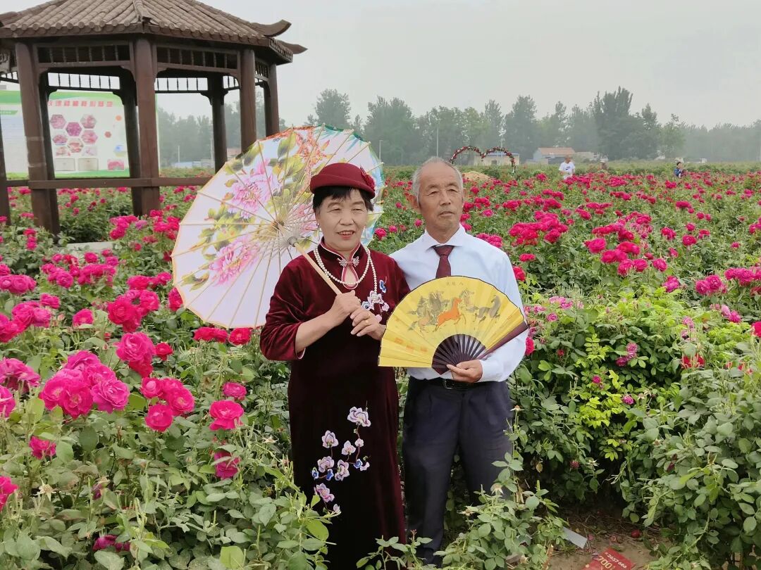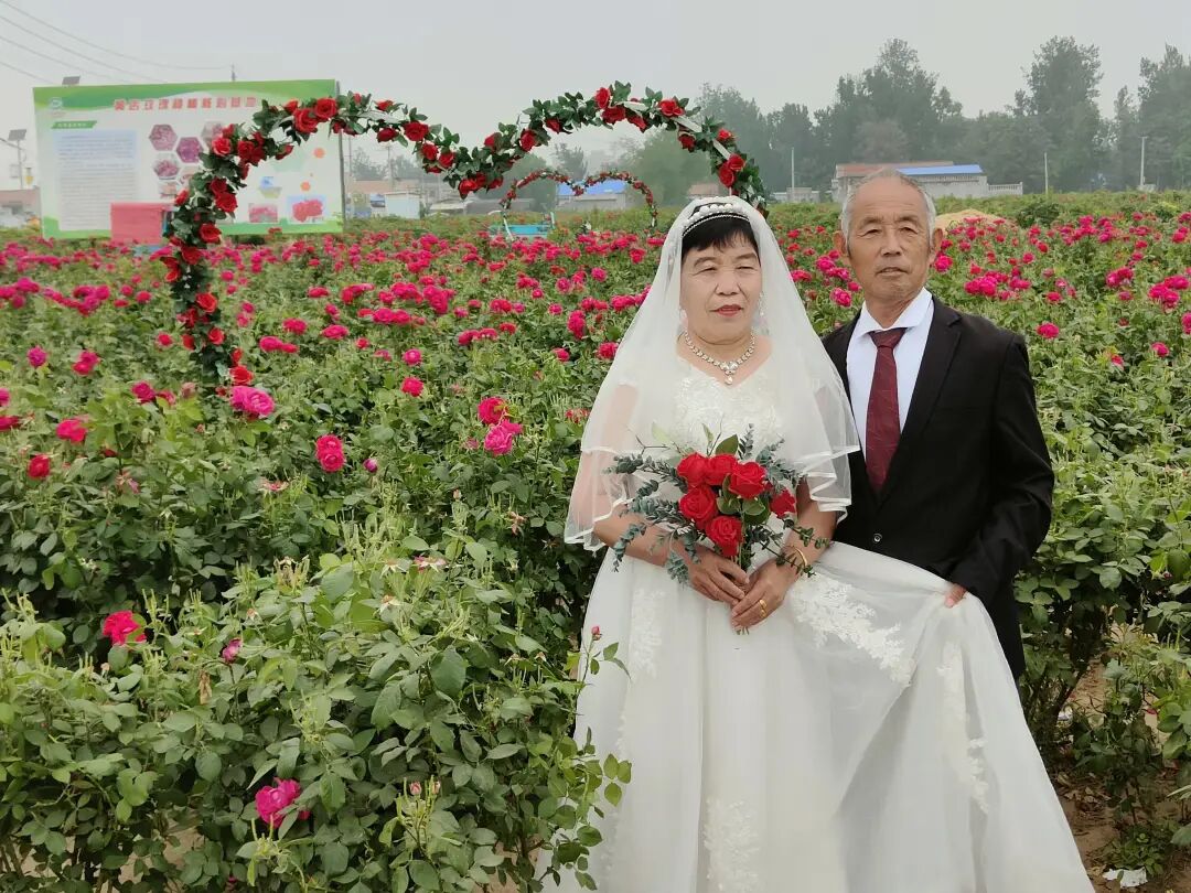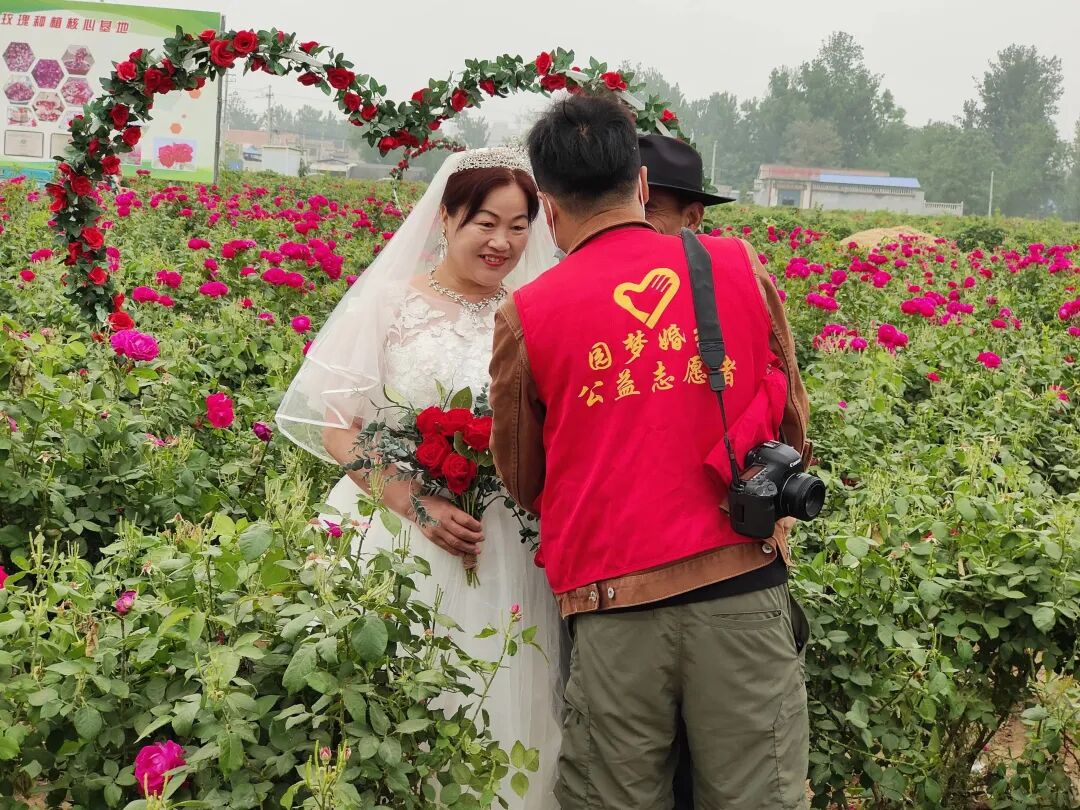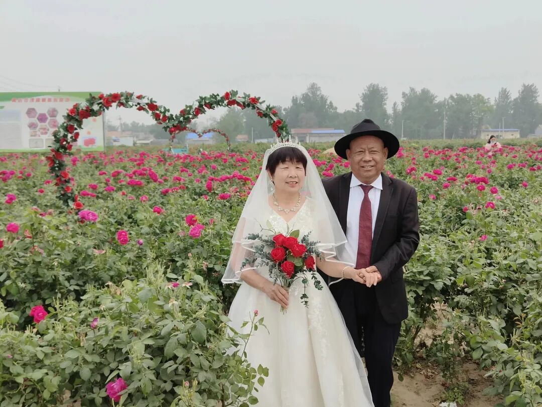 5月18日,定陶区黄店镇在万亩玫瑰园开展“时光记忆 幸福留影”新时代文明实践活动,免费为老年夫妻拍摄婚纱照,为他们送上珍贵的礼物。