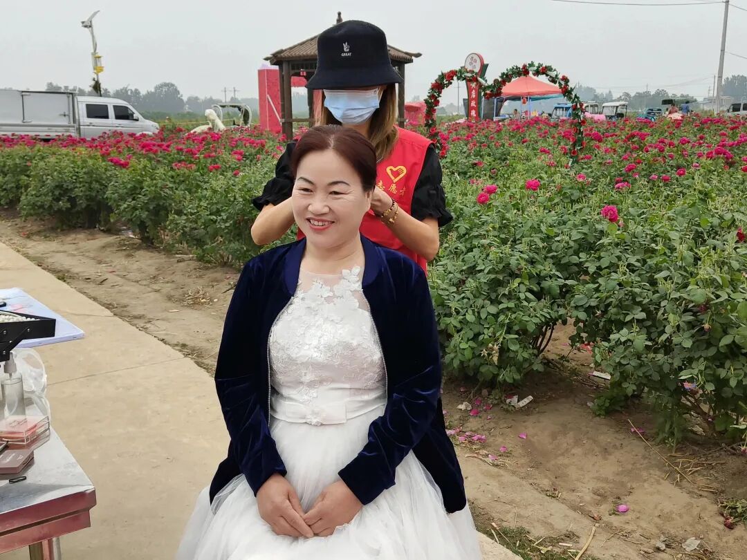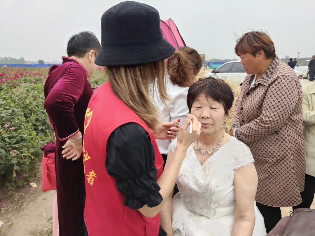 在万亩玫瑰园,志愿者耐心的为每对老年夫妻画上精致的妆容,为他们穿上漂亮的婚纱、旗袍。老人们个个精神饱满,开心地配合摄影师拍下一个个甜蜜幸福的瞬间。