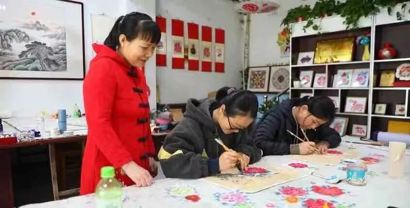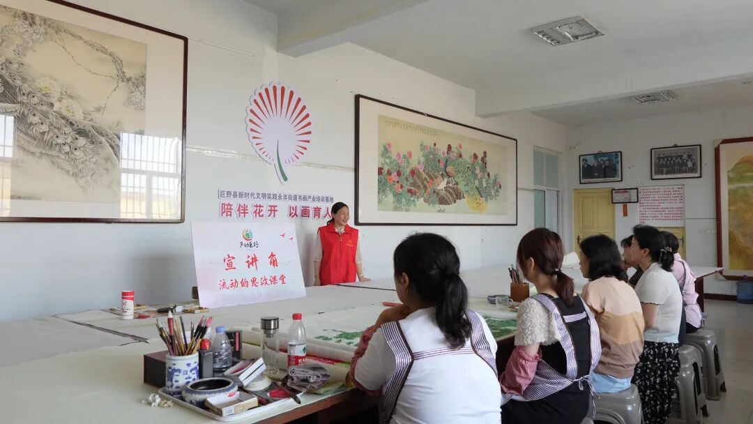 除此之外,巨野县还打造了“陪伴花开”新时代文明实践志愿服务品牌,把绘画、剪纸、编织等山东手造融入了家庭站,其中具有浓郁巨野地方特色的工笔牡丹画公益培训班,目前已开展公益培训37期,培养画师2000余人,让广大农村居民,特别是年轻妈妈实现了既可以在家陪伴孩子、照顾老人,又可以通过绘画拥有一定的经济收入的生活愿景。