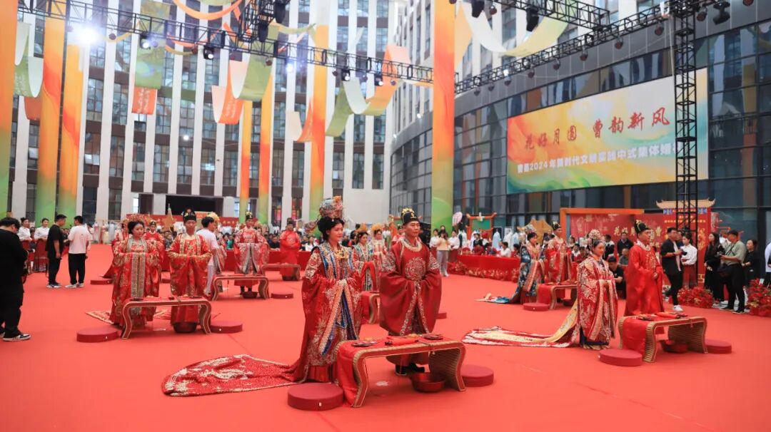 为弘扬文明新风,传承中华传统礼仪,引导广大青年树立正确的婚恋观、人生观、价值观,9月12日上午,“花好月圆·曹韵新风”曹县2024年新时代文明实践中式集体婚礼在e裳小镇·曹县数字经济产业园隆重举行,10对新人参加。