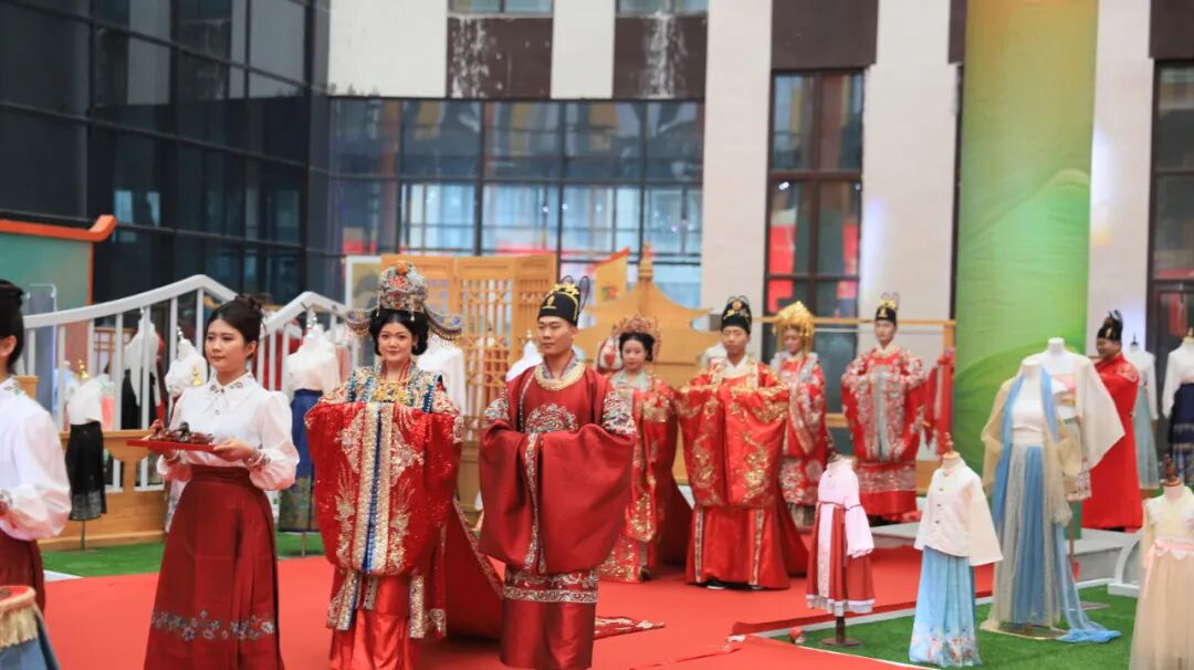 市县领导为新人颁发集体婚礼纪念证书,赠送国家级非遗江米人文创作品“百年好合”对偶、曹县马面裙、礼盒等新婚贺礼。