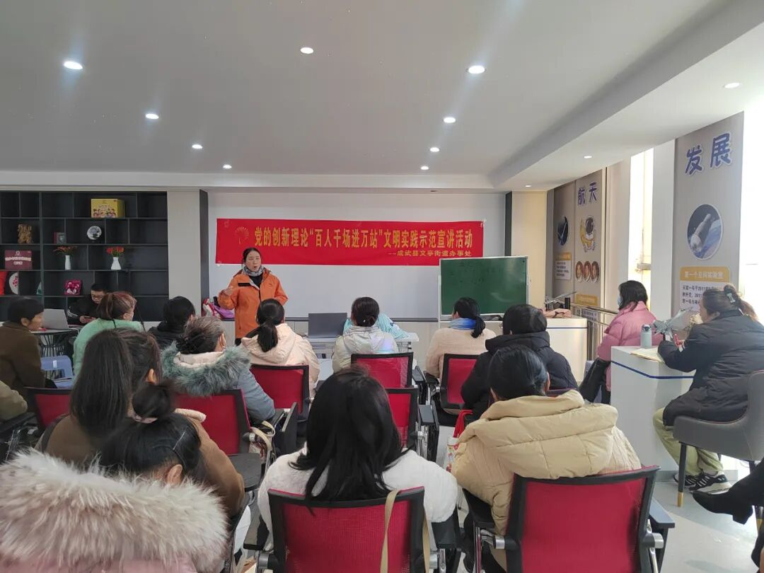 为推动习近平新时代中国特色社会主义思想深入人心,促进党的二十届四中全会精神在基层落地见效,成武县依托遍布全县的文化书院、银龄书院等特色阵地,深入开展“百人千场进万站”文明实践示范宣讲活动。聚焦乡村全面振兴、促进高质量充分就业、建设宜居宜业和美乡村等重大主题,以大众化、分众化、互动化的宣讲形式,让党的创新理论“飞入寻常百姓家”,凝聚起奋进新征程的强大精神力量。