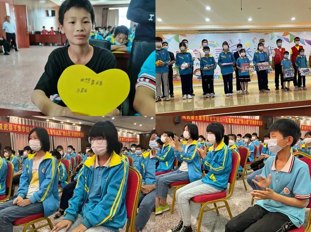 本次活动围绕困境儿童健康成长,细心收集了王集学校106名困境儿童的心愿,星火公益协会制定心愿清单,准备了孩子们的心愿礼物,县民政局为孩子们定制了爱心服装,并现场发放给他们,鼓励他们要坚强努力,立志向、有梦想,将来成为担当民族复兴重任的栋梁之材。