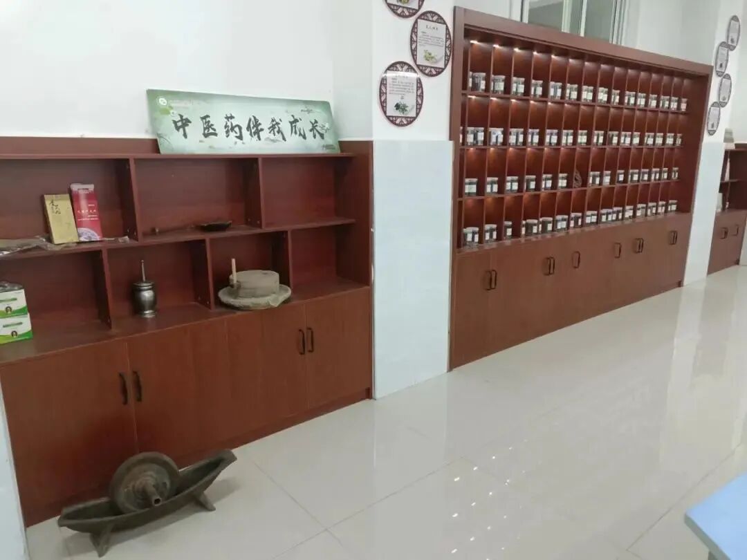 创建“百草堂”中医药活动实践室。“百草堂”中医药活动实践室墙壁布置了中医名人和有关中医知识挂图,学生进来就能感受到浓厚的中医文化气息;展柜中存放《本草纲目》、《黄帝内经》等200多本中医药书籍,药材样本近200种,中医药研制工具数件,学生可以自行观察了解;每个操作台上均配备人体经络模型及各类中药样本;同时活动室内还配备多媒体,保障“中医药文化进校园”活动正常开展。