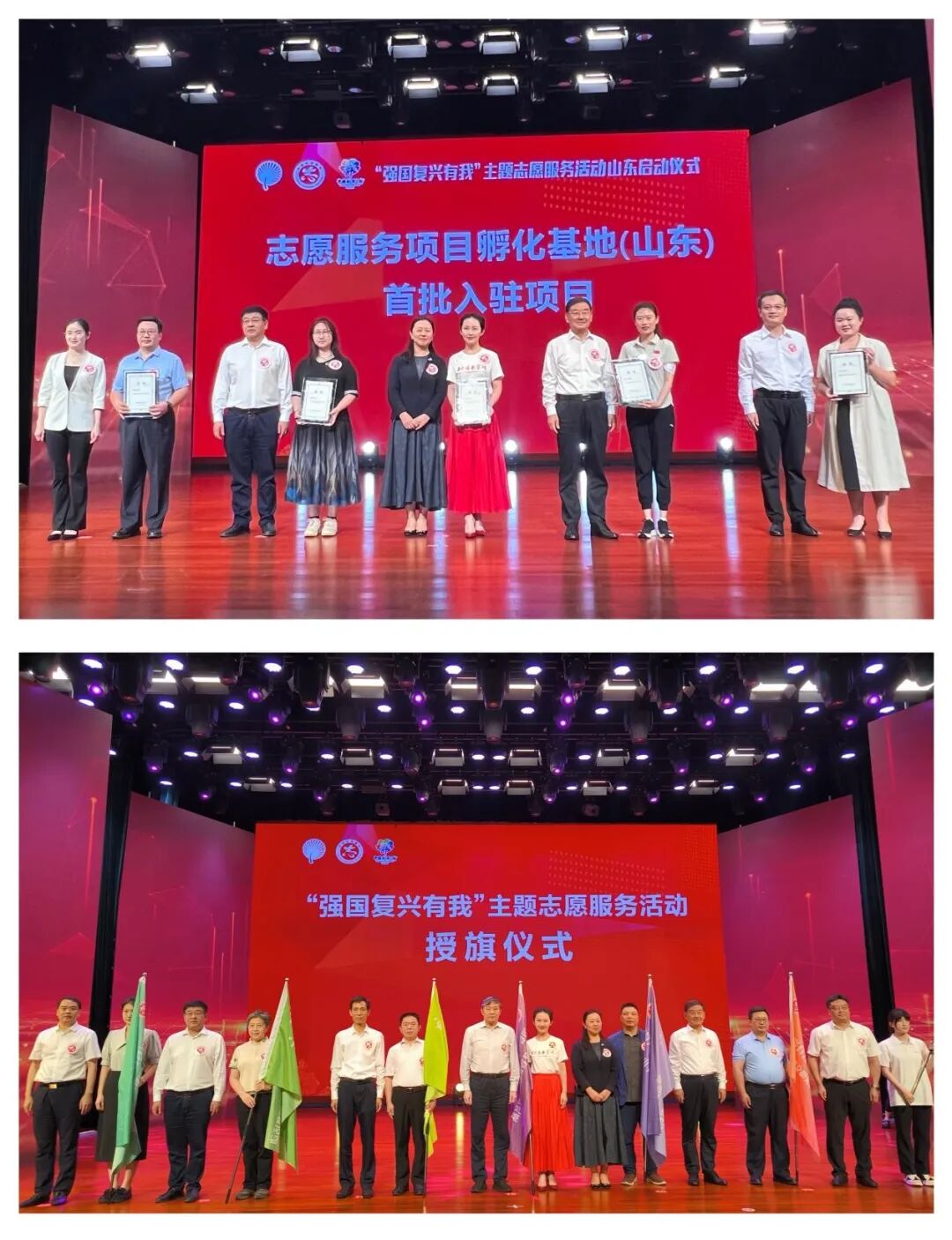 与会领导为首批入驻孵化基地(山东)项目颁发证书,并为现场志愿服务队伍代表授旗