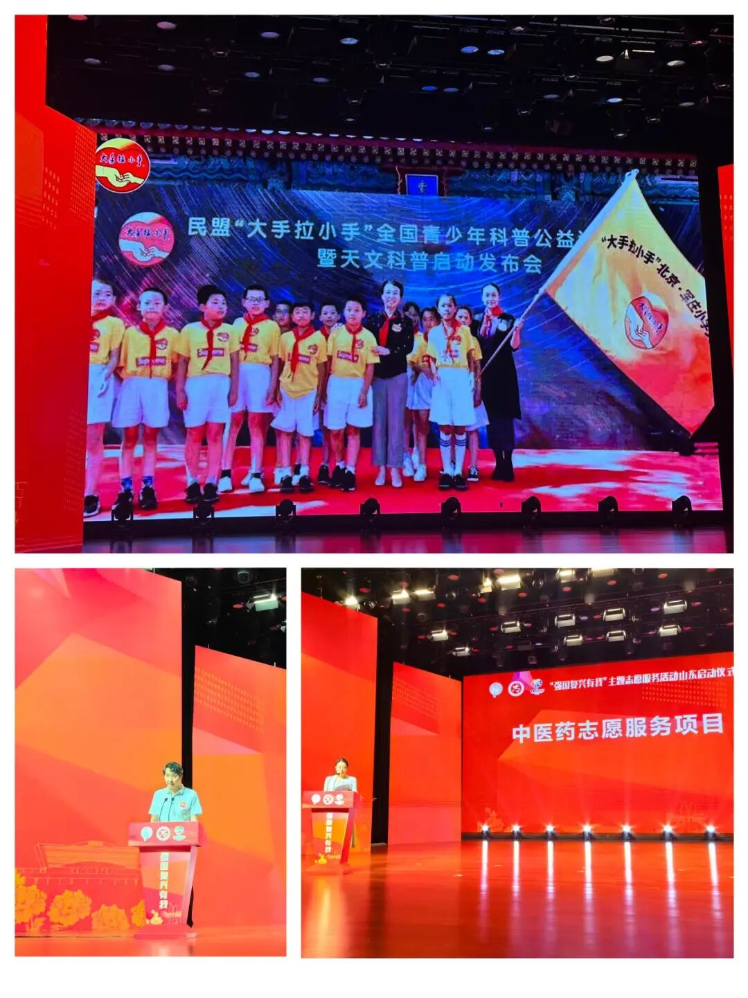“大手拉小手”志愿服务队代表,鄄城县委常委、宣传部长李沉静,菏泽市科技馆馆长胡秋艳,共同为体育文化交流基地、科普科幻教育基地揭牌
