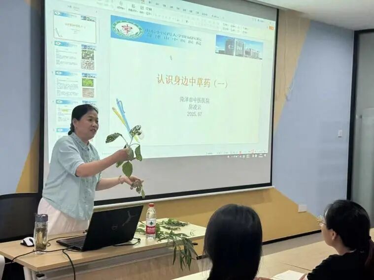 草药讲堂・干货满满。市中医院专家房凌云带着多年临床积累的中医药知识走进桑屯社区,以图文并茂的 PPT 展示植物形态,用新鲜草药标本直观呈现特征,从“药食同源”的生活场景切入,通过“蒲公英的清热功效”“金银花的泡水禁忌”“艾草的多样用法”等生动案例,详细讲解 10 余种常见中草药的辨识方法、药用价值及安全使用要点,让居民在熟悉的植物中发现中医药的智慧。
