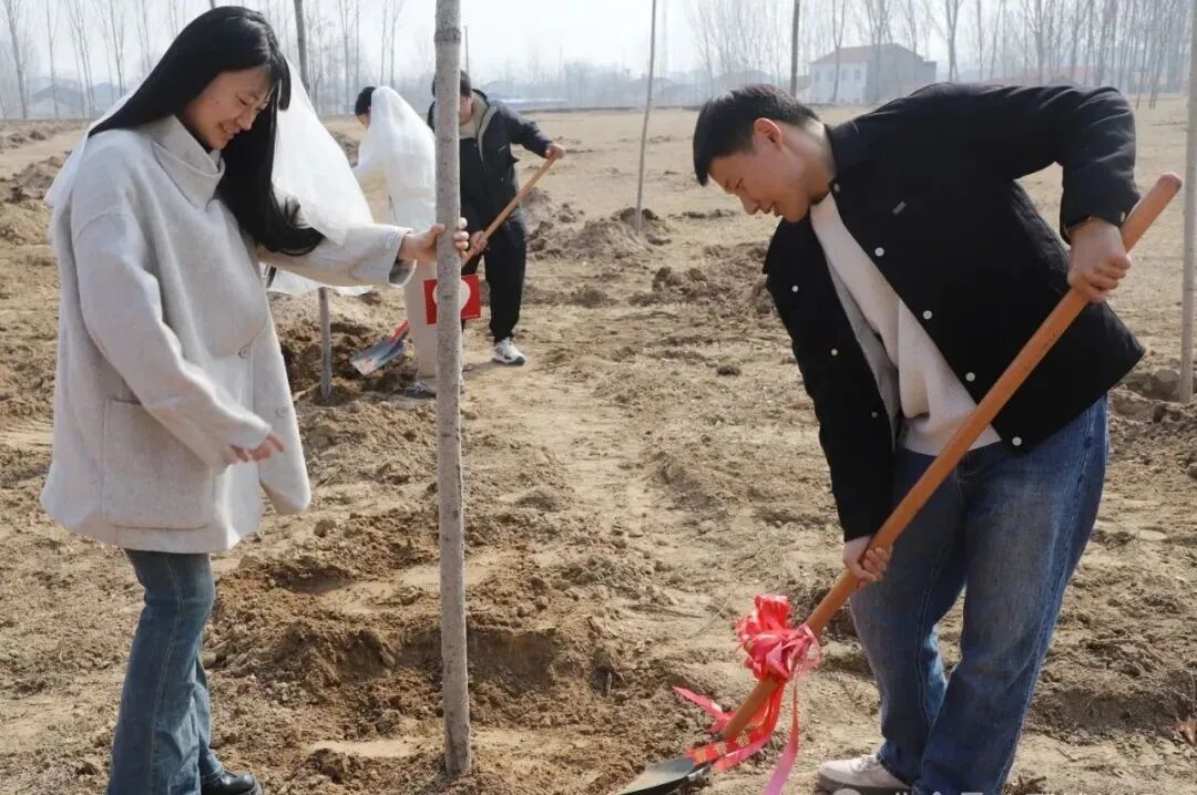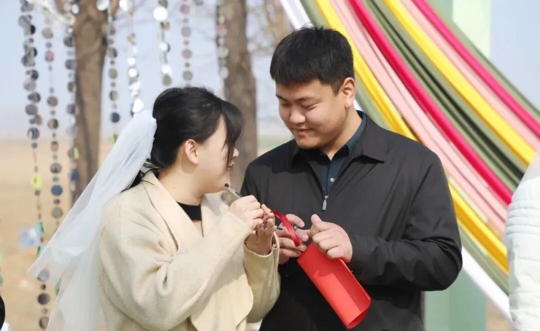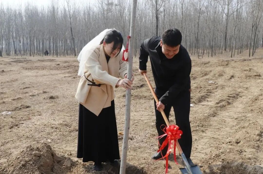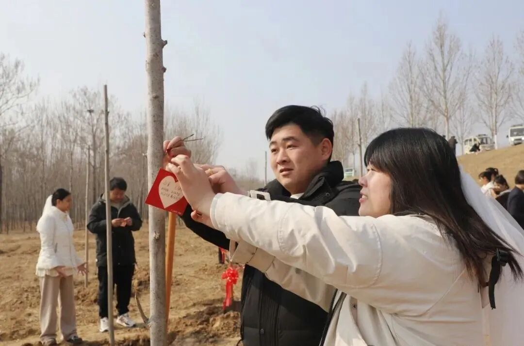 随后,新人们满怀对未来生活的无限憧憬,深情地将对彼此的承诺一笔一划写在“心愿卡”上,然后挥锹铲土,共同栽种下镌刻婚姻幸福的“爱情树”,并心愿卡”小心翼翼地系在树枝上,让这份对未来的期许和爱意,在春风中生根发芽。