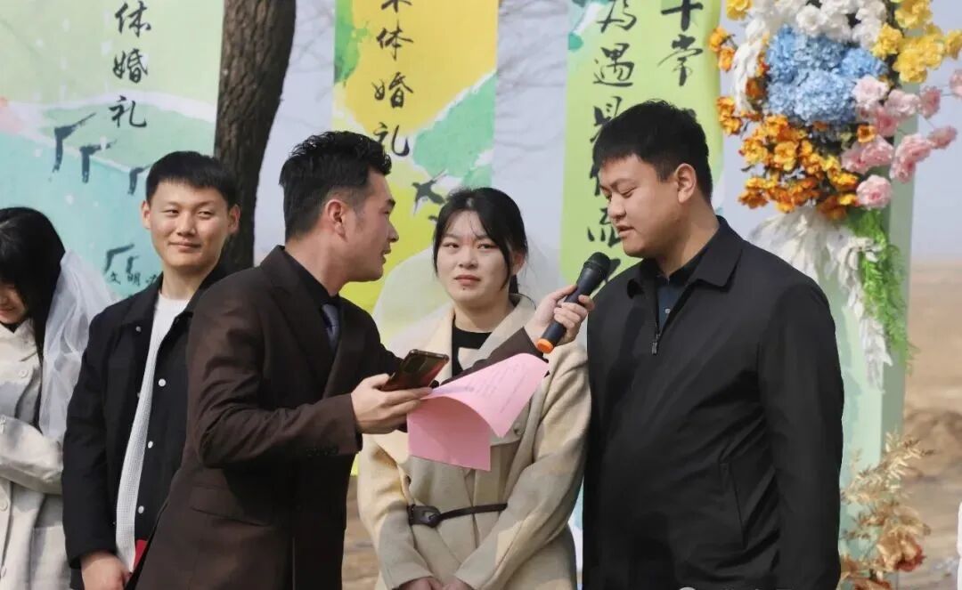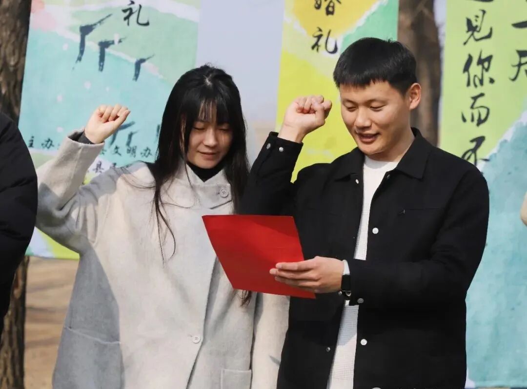 在祝福声中,新人们携手步入婚礼现场。鄄城县委宣传部相关负责人为新人们送上真挚祝福,县民政部门相关负责人担任证婚人,庄重地为新人证婚,让这场婚礼更具意义。