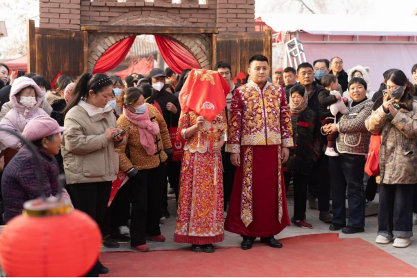 建成新时代文明实践礼堂、新礼仪基地等应用场景28处,充分利用乡镇党校、新时代文明实践广场、旅游景点等场所,积极拓展新时代文明实践阵地功能,结合群众意愿,推广集体婚礼、集体颁证、中式婚礼、新式婚礼等,创新推出水上婚礼、田园婚礼、家风礼堂、好亲家共享“好食光”等特色场景。2025年初,成武县依托党集古村文化资源丰富的特点,将一处鲁西南传统民居改建成婚俗改革创新示范基地,这个新风小院以场景再现、互动体验、实物展陈等多种形式,展示了鲁西南上世纪七、八十年代民俗婚礼现场和婚礼形式等婚俗文化,引导群众感受婚姻之美、婚姻之责、婚姻之义,注重“家庭、家教、家风”建设,践行移风易俗新风尚。另一方面,与当地非遗传承人、民俗土专家沟通交流,挖掘具有地域特色的传统婚俗文化,定制“三拜礼”“结发礼”等仪式流程,将“敬父母、重承诺、守忠贞”等优秀传统婚俗文化提炼转化,新人穿传统服饰、写婚书、行传统礼仪,可参与、可体验、可互动,现场群众共同感受传统婚俗文化的情感温度。