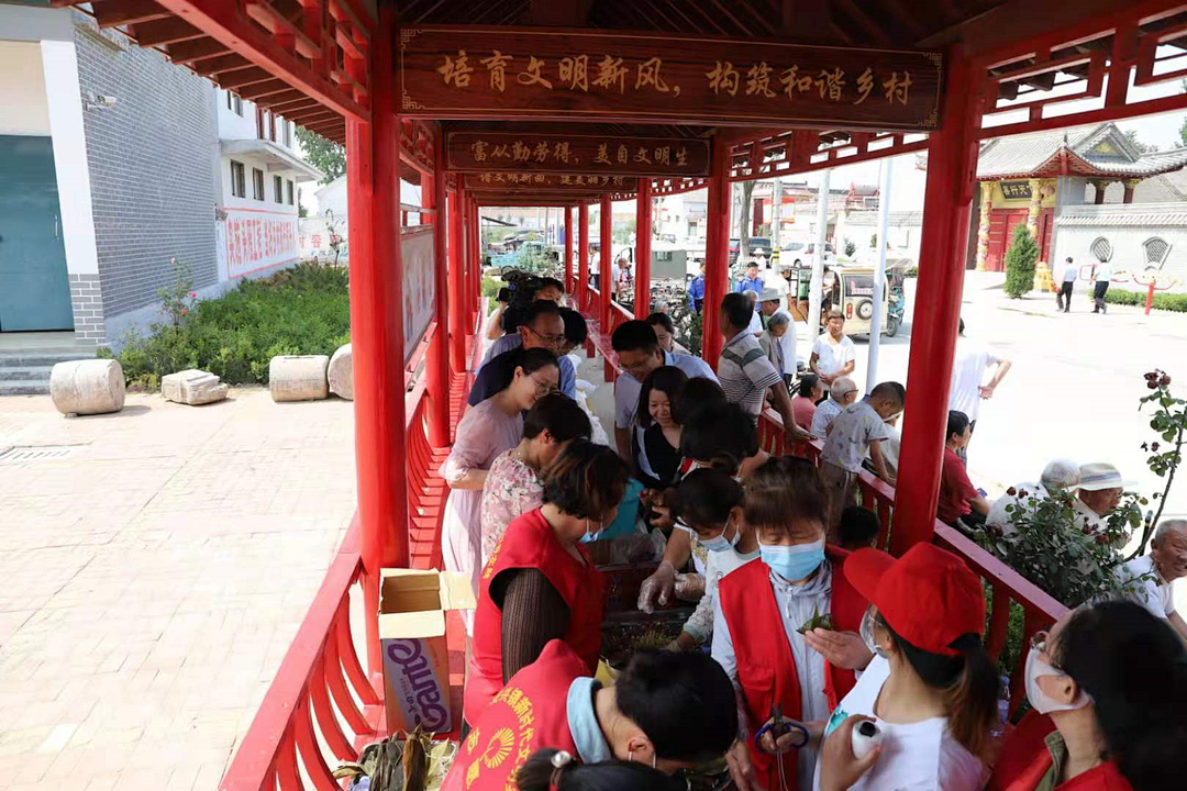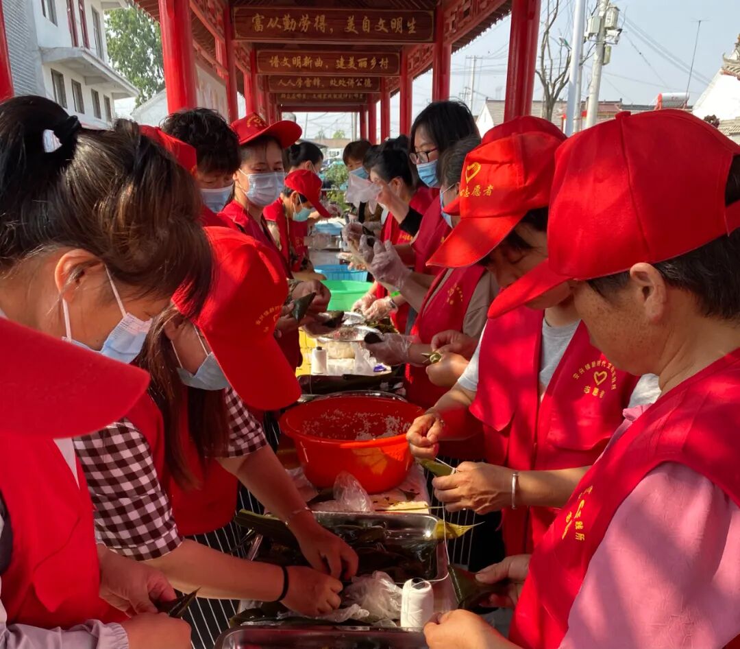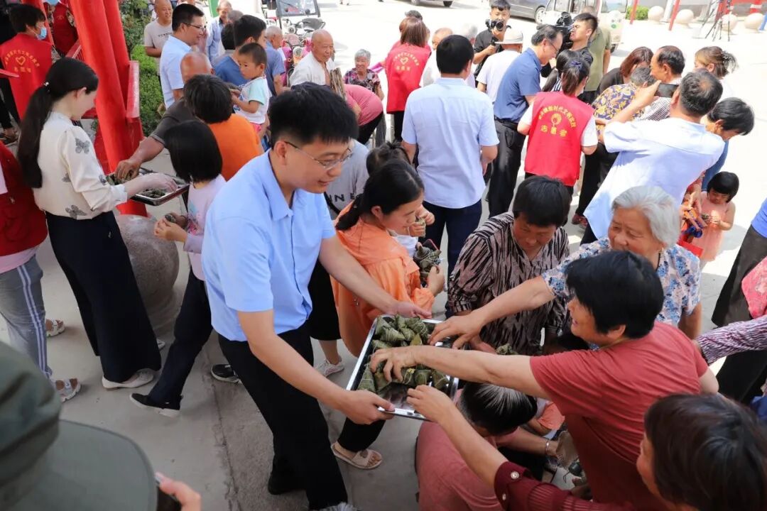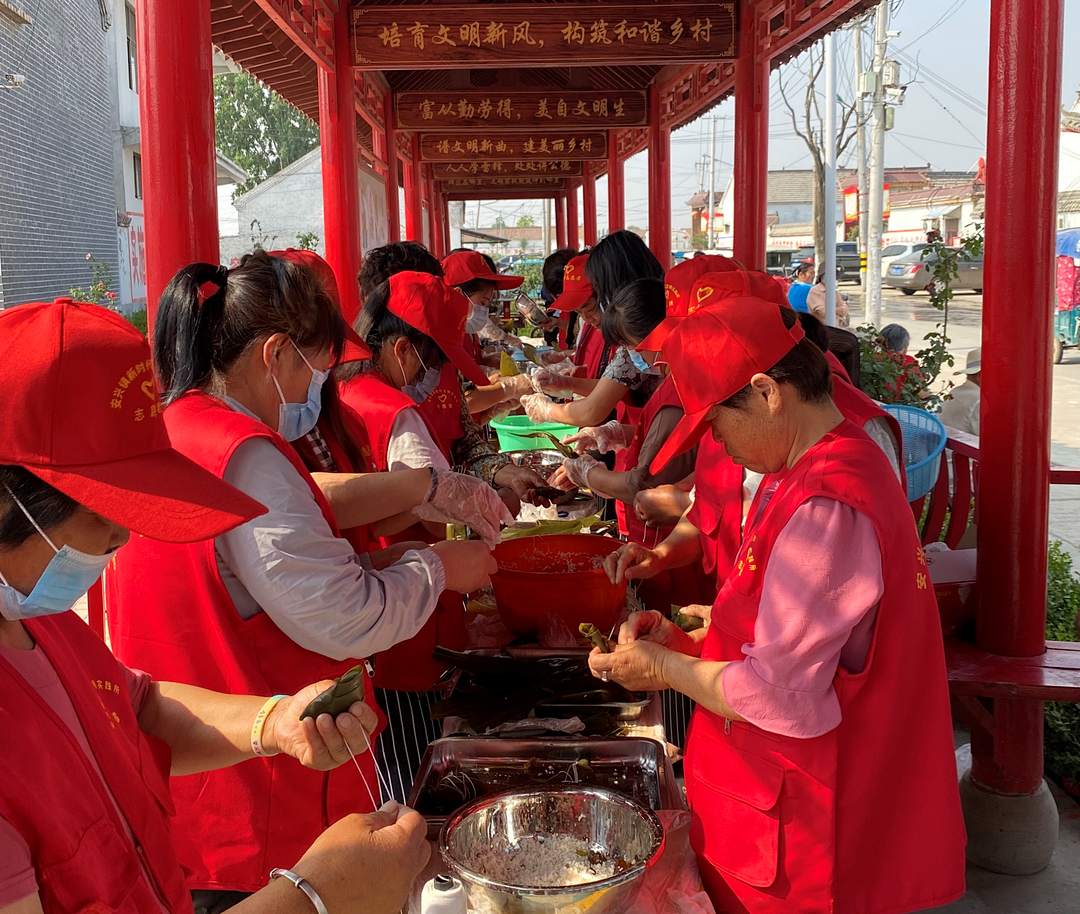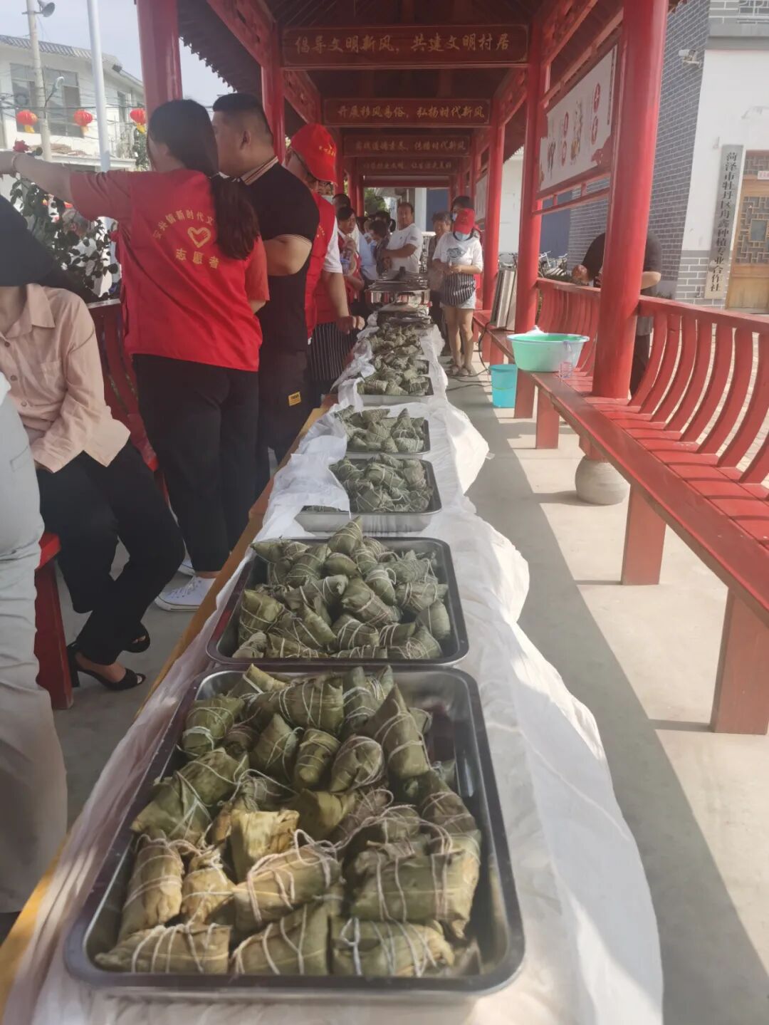 不远处的船郭庄村新时代文明实践长廊下,身着红马甲的志愿者们不停忙碌着,一双双灵巧的手上下翻动,不一会儿,清香的箬叶、剔透的米粒就成了一个个漂亮清秀的粽子,粽子包好、煮熟后一盘接一盘地分发给现场的父老乡亲。飘香的粽叶伴随着现场欢乐和谐的气氛,让老少村民在感受传统节日文化魅力的同时,增进了彼此的情谊,促进了村居的文明乡风。