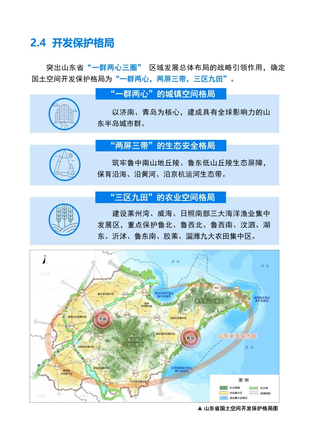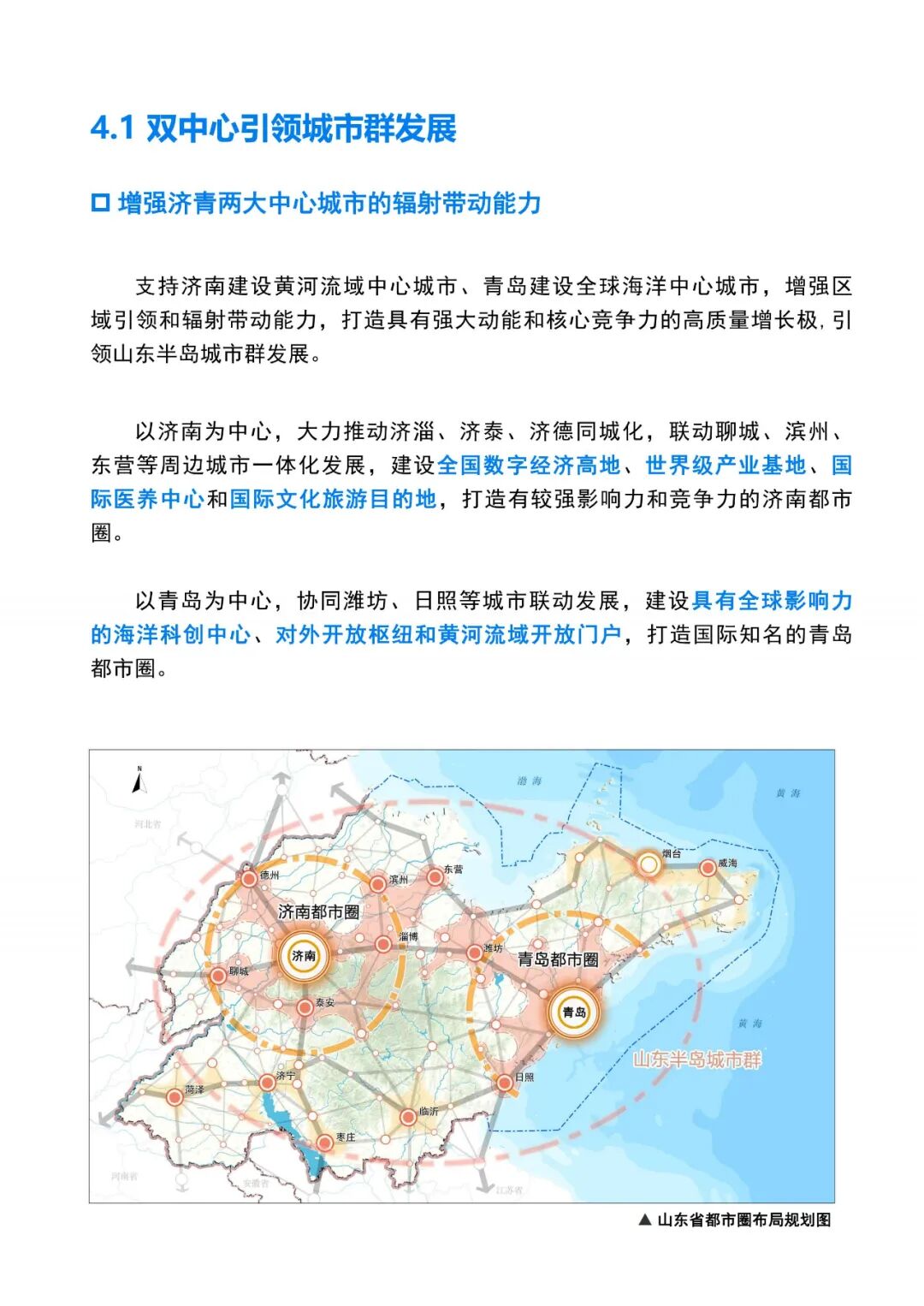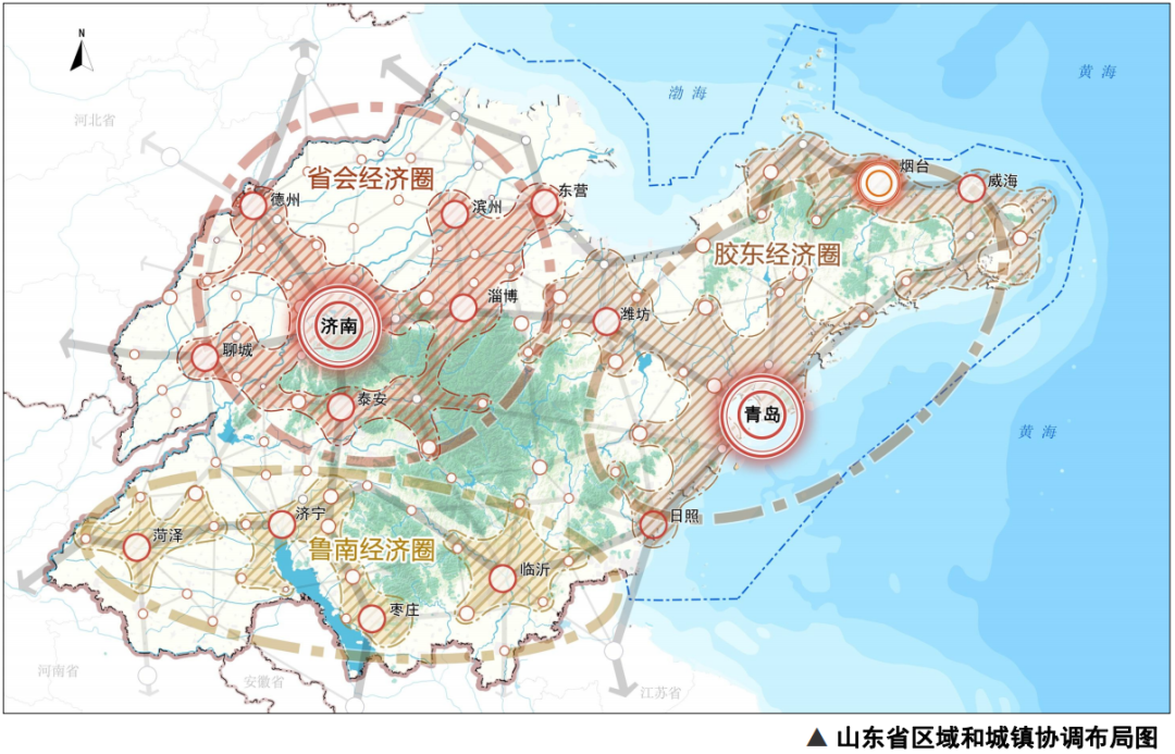 《规划》提出,山东将围绕落实黄河流域生态保护和高质量发展战略,充分发挥山东半岛城市群龙头作用,提升济南、青岛两大中心城市能级,做强省会经济圈、提升胶东经济圈、振兴鲁南经济圈,形成高效、集聚、富有活力和竞争力的城镇空间新格局。