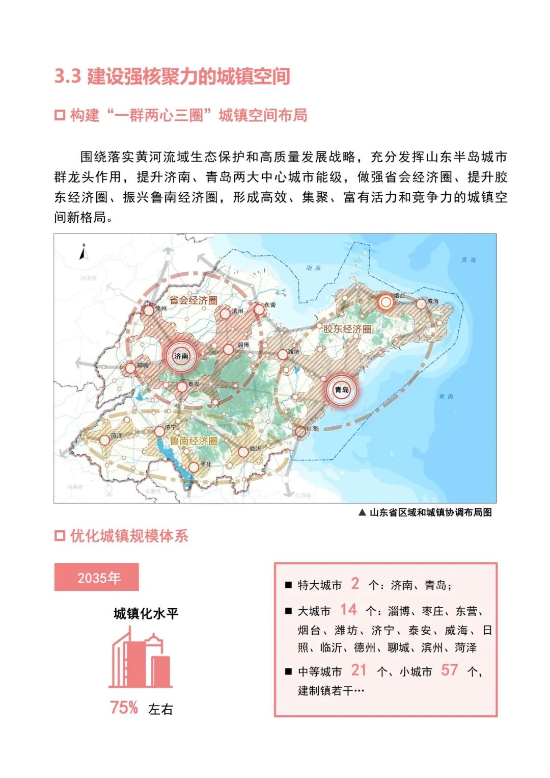 《规划》提出,到2035年,山东城镇化率将达到75%左右,形成2个特大城市:济南、青岛;14 个大城市 :淄博、枣庄、东营、 烟台、潍坊、济宁、泰安、威海、日 照、临沂、德州、聊城、滨州、菏泽。