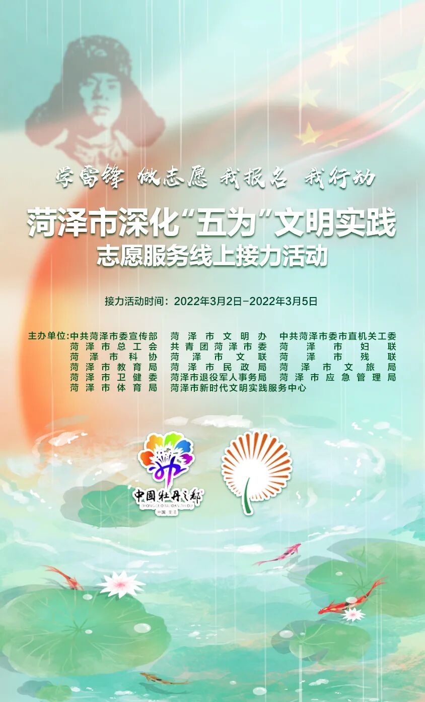 为进一步弘扬雷锋精神,推动志愿服务走深走实,2022年菏泽市将重点围绕为老、为小、为困难群体、为需要心理疏导和情感慰藉群体、为社会公共需要服务五个方面,大力开展“五为”文明实践志愿服务活动。市委宣传部、市文明办等17家单位联合推出“学雷锋 做志愿 我报名 我行动”菏泽市深化“五为”文明实践志愿服务线上接力活动,欢迎广大市民朋友积极进行线上接力,参与志愿服务活动。