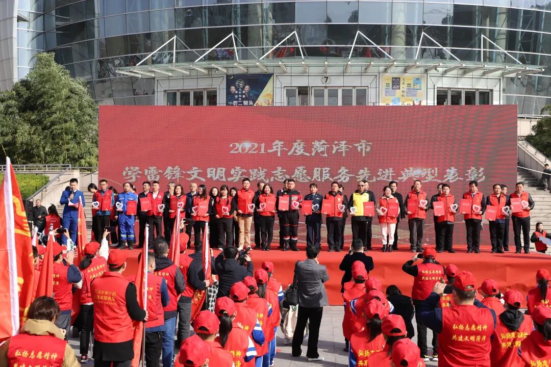 启动仪式上,与会领导为18名2021年度全市学雷锋文明实践志愿服务先进典型代表和10名2021年度菏泽市岗位学雷锋标兵、10处学雷锋活动示范点颁发奖杯证书和荣誉牌,并向新成立的两支市级新时代文明实践志愿服务专业队伍、四支学生志愿服务队授旗。