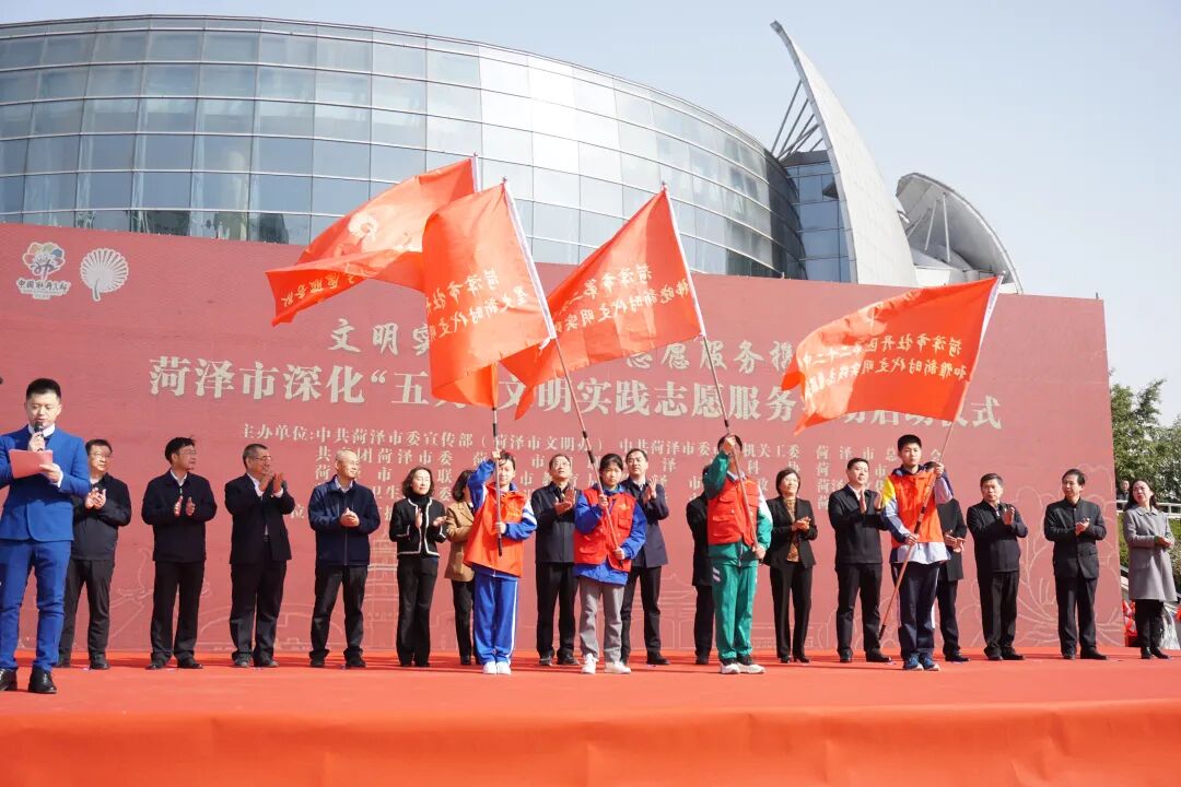 为市第一实验小学星河新时代文明实践志愿服务队、市第二实验小学拂晓新时代文明实践志愿服务队、牡丹区实验小学星火新时代文明实践志愿服务队、牡丹区第二十二中学和雅新时代文明实践志愿服务队授旗