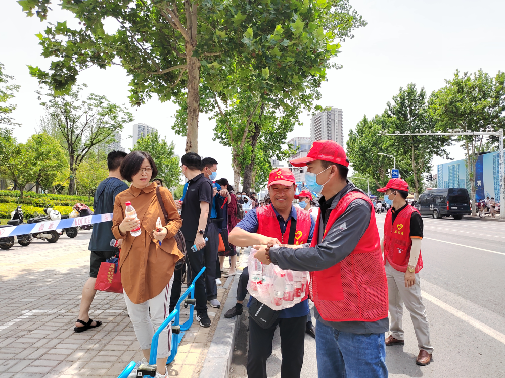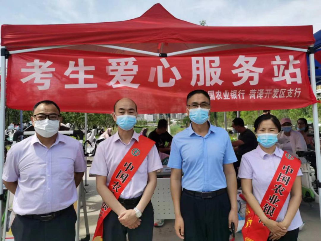 中国农业银行菏泽分行组织各支行志愿服务队在考点周边设立服务站,为考生及家长免费提供饮用水、文具、防疫物资、休息场地等,并向等候区家长普及反金融诈骗等知识,展现了大行担当,受到了群众一致好评。