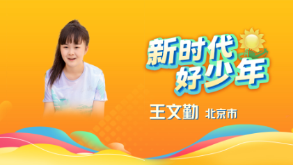 8、王文勤 女,汉族,2012年10月生,少先队员,北京教育科学研究院通州区第一实验小学五年级学生。她热爱中华优秀传统文化,常常动手制作手工艺制品。她制作的掐丝珐琅作品《变》获得北京市中小学生戏曲文创大赛一等奖;设计的藏书票作品“北京的脊梁——中轴线”在北京市中小学生藏书票设计比赛中荣获小学组三等奖。她积极参加志愿服务活动,作为故宫小讲解员,讲述故宫故事;作为运河小宣传员,为游客讲解“三庙一塔”等大运河文化。她还受邀参加纳米比亚英雄日活动,在70多个国家的大使面前展现中国少年儿童的精神风貌。她热心公益,通过绘画的方式筹措公益金,为贫困地区的孩子捐钱捐物,帮助他们的学习生活。