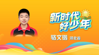 9、骆文锴 男,汉族,2009年10月生,共青团员,河北省秦皇岛市第七中学初二年级学生。他热衷人工智能,积极参加各项科技活动,曾获世界机器人大赛锦标赛一等奖、RoboRAVE国际教育机器人大会亚洲区二等奖,在国家和省级赛事中多次取得好成绩;他还利用节假日开展科技宣讲,推广和普及科技知识。他积极参与志愿服务,参加公益活动190余次,志愿服务时长350余小时,关心帮助困难老人和儿童9人。曾获河北省“红领巾奖章”个人四星章、河北省“新时代好少年”。