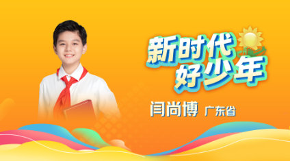 33、闫尚博 男,汉族,2010年4月生,少先队员,广东省广东实验中学初二年级学生。他来自军人家庭,在红色家风的熏陶下,他热爱祖国,信念坚定,多次参与“广州好家风”“英雄花开英雄城”等活动。他热爱表演、演讲、写作,曾参与全国少工委出品的《少年之光》歌曲MV录制,在共青团中央、全国少工委开展的主题云队课中作为开场节目播出,在“描绘十年非凡成就 喜迎党的二十大”作品征集活动中荣获一等奖,在全国、省、市各级语言艺术大赛中7次获得特等奖和一等奖。曾获全国“优秀少先队员”、广东“新时代好少年”。