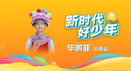 41、毕鹏菲 女,彝族,2010年7月生,少先队员,云南省大理州巍山县祥华中学(北桥校区)初一年级学生。她自立自强,勤奋学习,全面发展,是家中的“小大人”,是同学们的“好姐姐”,更是老师的“小助手”。她是班集体的一面“小旗帜”,勤于思考、好学上进、脚踏实地,不仅自己学习成绩优异,还带动班上同学共同进步,在她的带动下,全班的学习氛围更加浓厚,形成了全班刻苦学习、比学赶超的良好学风。她立志将来成为一名老师,回到家乡教书育人。曾获全国“优秀少先队员”、“新时代云南好少年”。