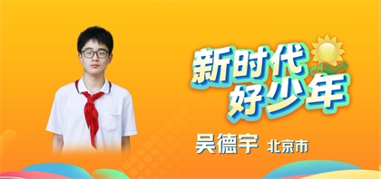 2、吴德宇 男,汉族,2008年11月生,共青团员,北京景山学校九年级学生。他曾担任学校少先队大队委,曾加入学校国旗护卫队、红领巾广播站、红领巾讲解团等。2021年7月1日,作为少先队员代表参加庆祝中国共产党成立100周年大会,是十人领诵团成员之一,代表全国青少年向党致以青春的礼赞。从2021年4月到7月,他经历了三个月的党史学习和综合培训,这段红色教育经历让他对国家、对人民的热爱更加强烈。活动之后,他更加积极主动地了解党和国家的大事,积极参与志愿服务和红色宣讲活动,先后在“青春宣讲团”、“庆祝香港回归25周年纪念活动”等活动中讲述红色故事。曾获北京市“三好学生”。