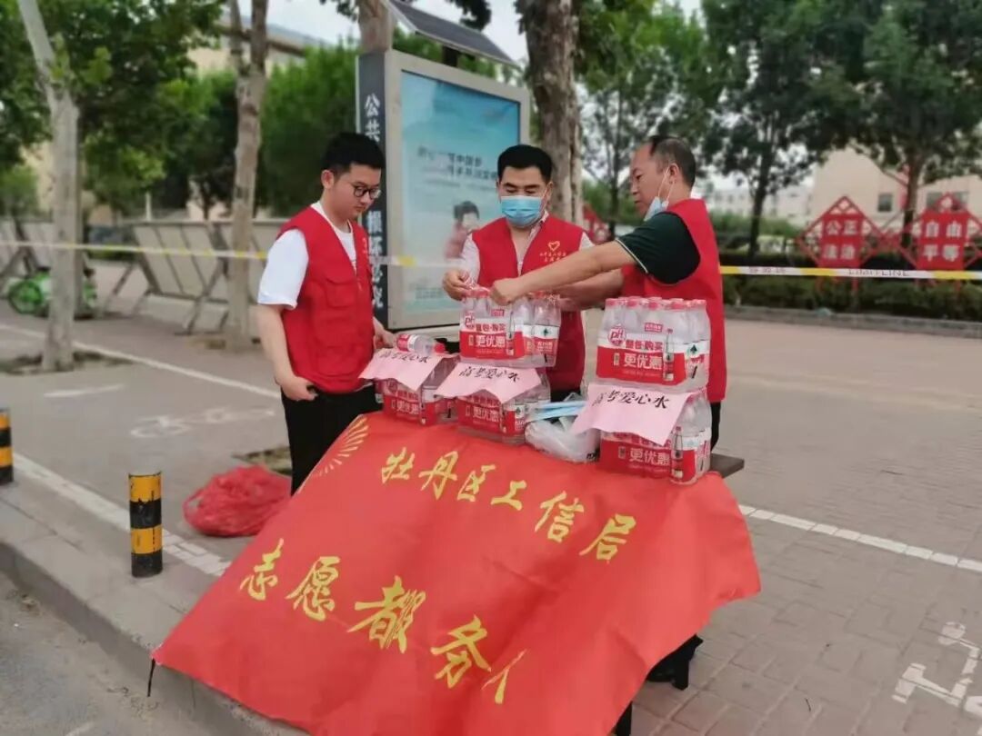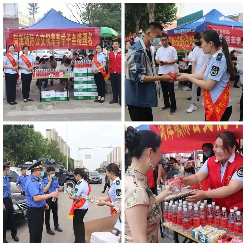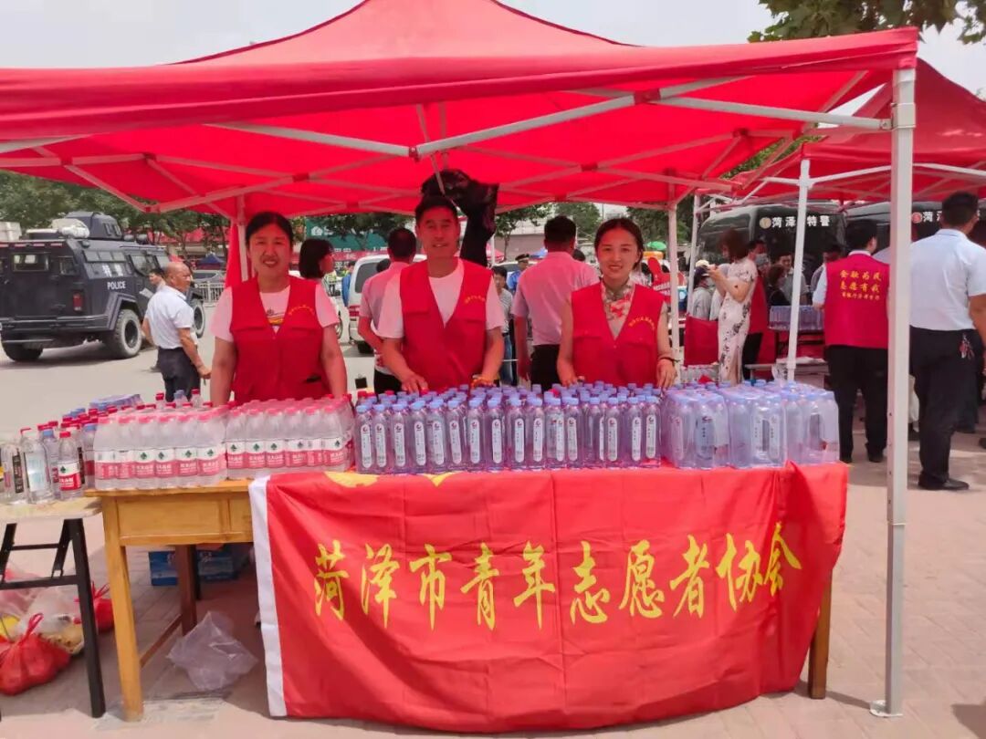 菏泽市新华书店志愿者们分别在二十一中考点、实验中学考点免费为考生及考生家长提供纯净水,助力高考。