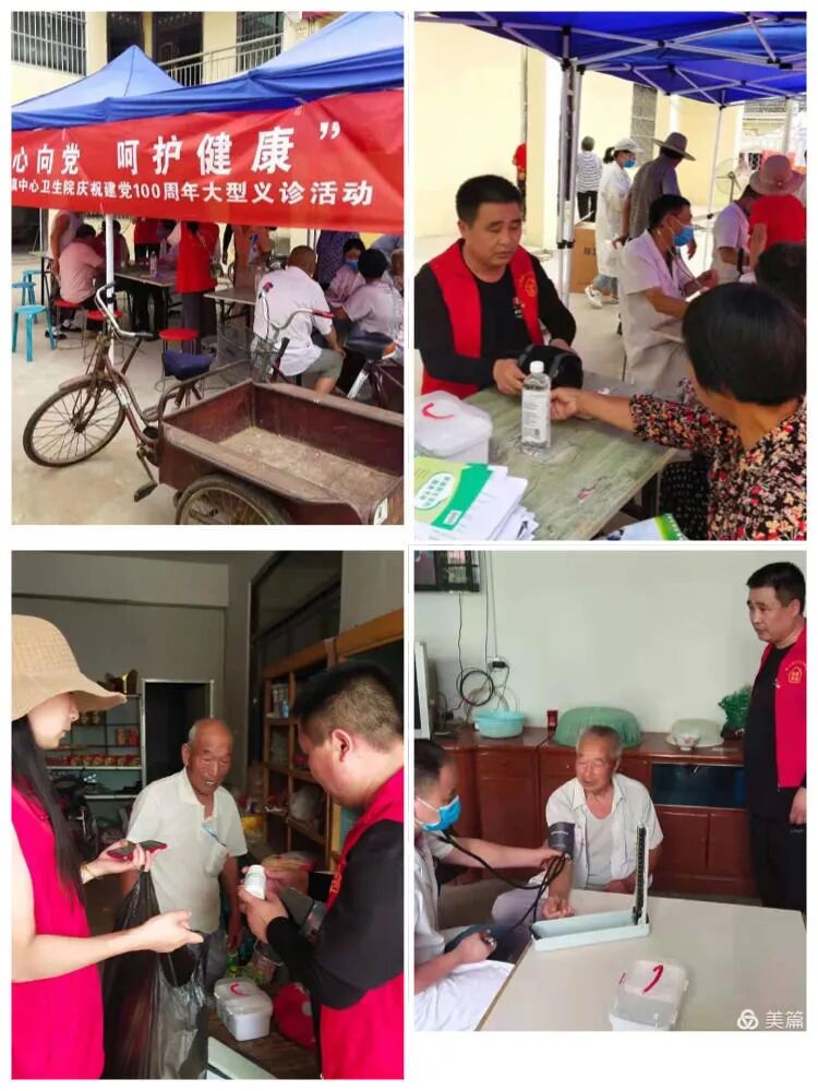 区医疗卫生志愿服务队开展“医心向党,呵护健康”大型义诊活动,为社区居民测血压、量血糖、测视力,解答用药方面的问题,对一些行动不便的老人上门问诊。
