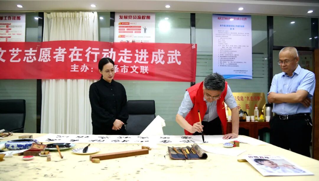 文艺志愿者们以饱满的热情来到成武城投集团,为企业员工精心创作书画作品。大家现场挥毫泼墨写字作画,笔尖蓄满激情。一幅幅字画或遒劲有力,或灵动飘逸,或形神兼备,或气韵非凡,公司员工现场观赏学习,感受笔情墨趣的艺术,共话文化强国的民族情怀。