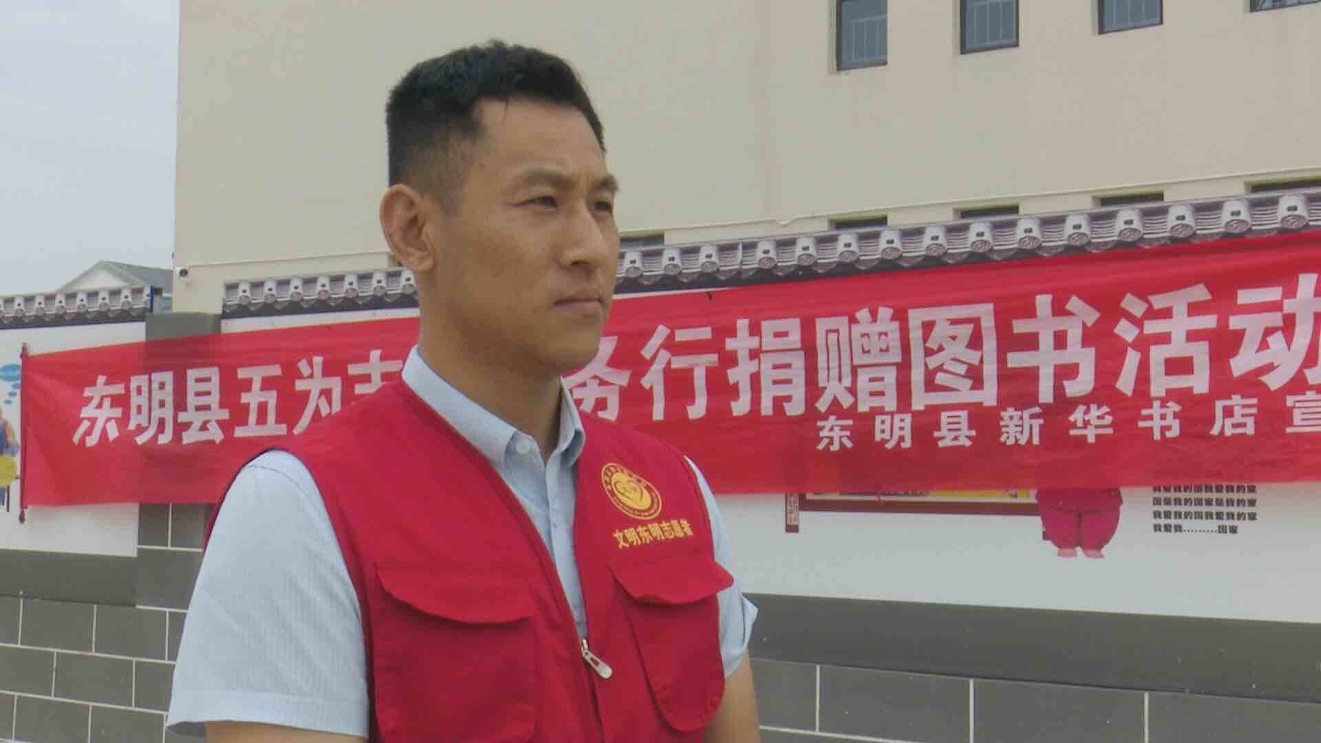 东明县新华书店门店副主任王震:“为了这次“五为”活动,我们新华书店为菜园集一号村台的学生及广大读者免费赠送少儿读物和农业养殖类读物,积极配合这次活动的圆满举行。”