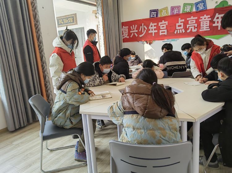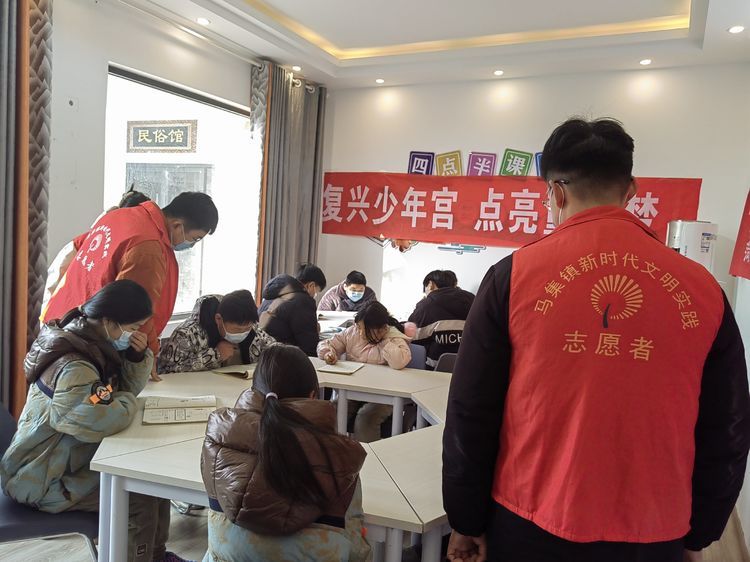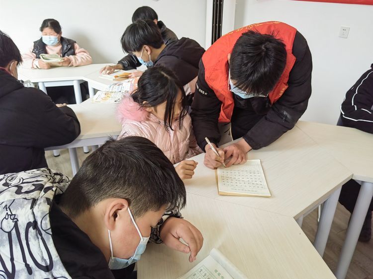 “根据x、y值,在坐标轴上确定点的坐标,这一步能理解么”“嗯嗯,明白了”“好,那我们继续往下学习”……春节期间,在菏泽市定陶区马集镇复兴少年宫内返乡大学生志愿者们正在给村里的学生们辅导功课。