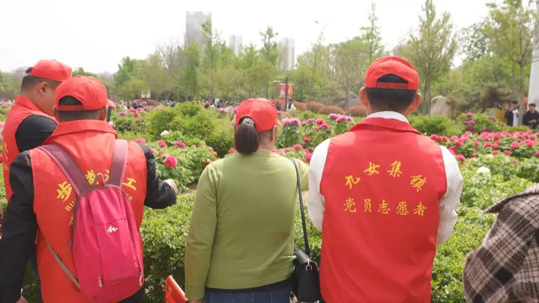 上午9点,曹州牡丹园内迎来了一群头戴小红帽的老年人,平均年龄65岁的他们在园内格外显眼。他们在步楼村志愿者的带领下,沿着牡丹园主干道赏花。老人们对着牡丹花比划着,兴高采烈地谈论着,有的还拿出手机,拍下好看的牡丹花留念。