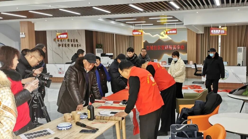 古城社区银领之家气氛活跃,社区居民热情高涨,“九州喜庆元春日,四海欢呼大有年”“中华崛起迎盛世,巨龙腾飞颂党恩”......一幅幅歌颂党、歌颂祖国、歌颂盛世、歌颂新生活的春联送到居民手中,整个现场被喜庆的红色渲染。